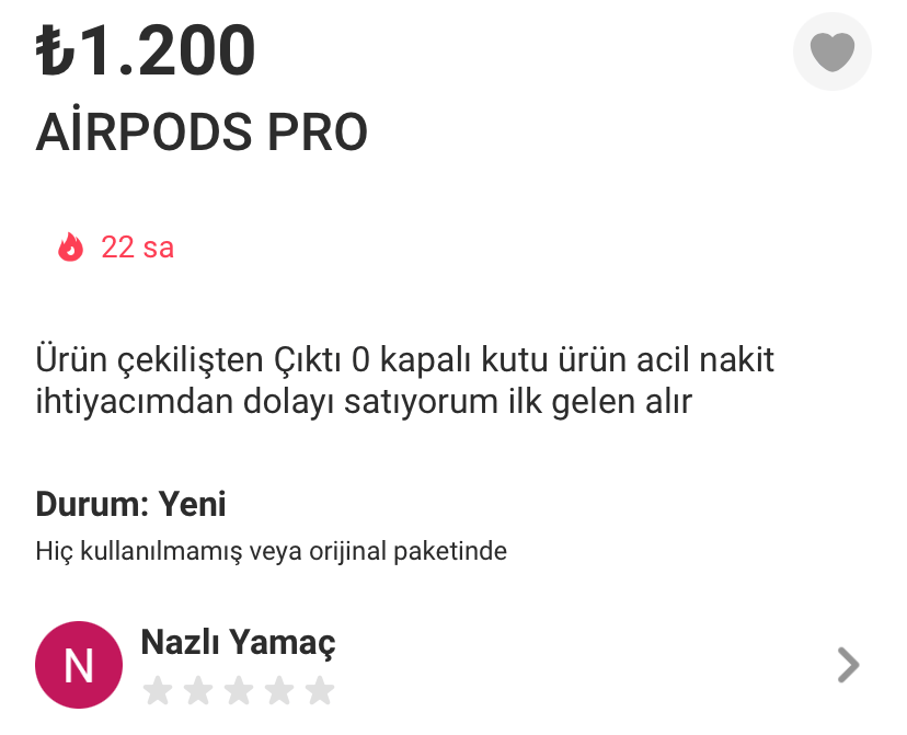 Ayrılırken çocuğun satmaya getirdiği sahte airpodsu geri vermedik. Kendimizce adalet getirdik. Çünkü bir cezası olursa belki bırakırlar diye düşündük. Arada bakıyorum, bence sahte airpods ilanları hala var. O mudur bilmem. Ama siz siz olun 0 yorum 0 ilan insanlardan ikinci el alışveriş yapıyorsanız anladığınız bir şeyler alıp satın.